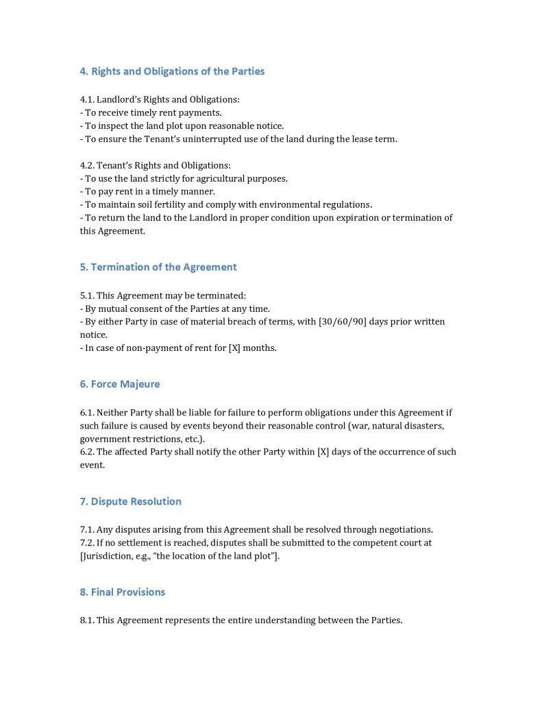 It is important to clearly specify the rent amount and payment deadlines in the agreement. It is also recommended to provide for indexation depending on inflation or market prices for agricultural products.